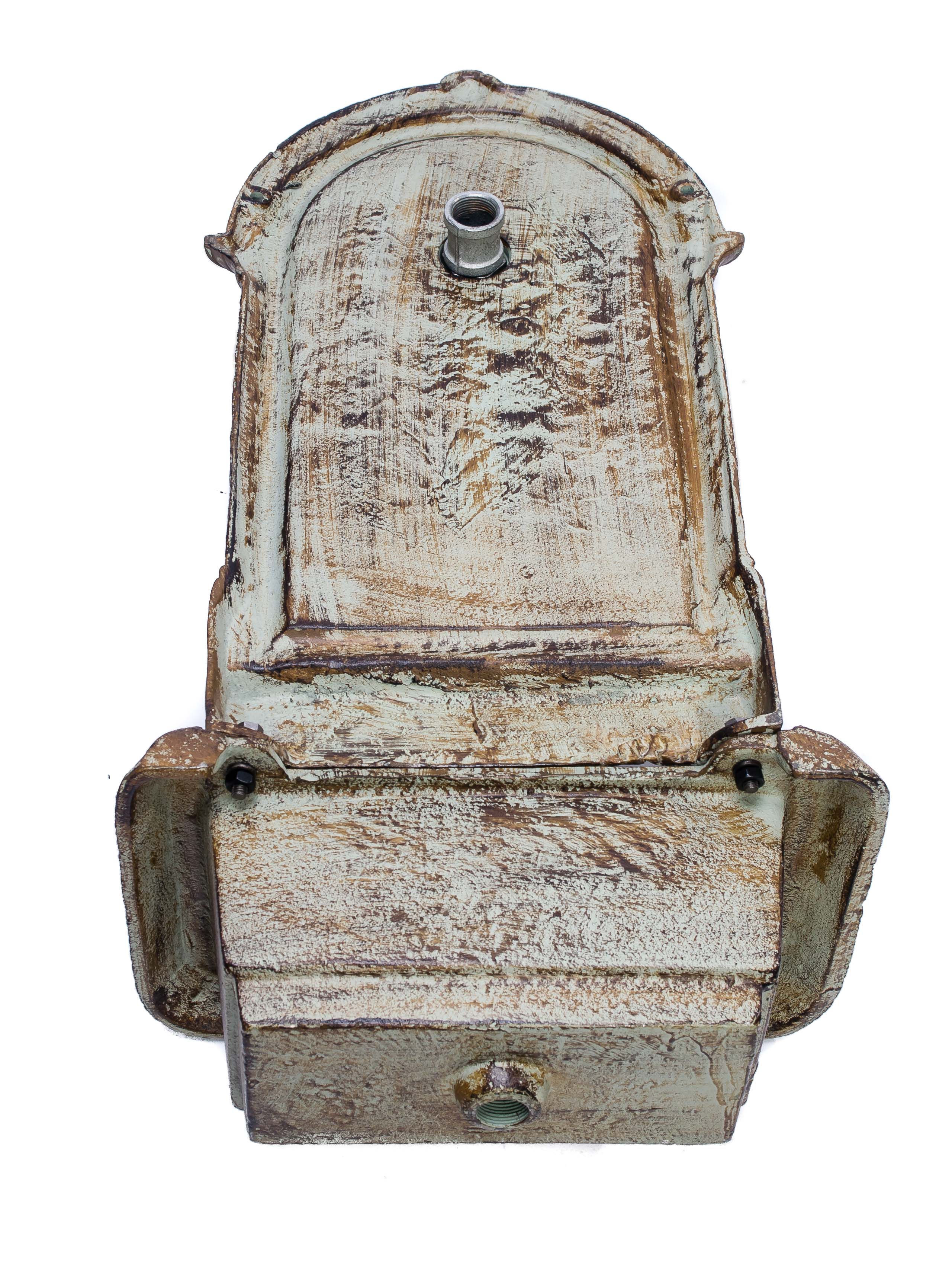 Exquisite wall fountain made from solid iron, inspired by an antique design. Vintage design with an antique patina, recreated by hand. This is a solid piece, weighing 16kg. The item is delivered unassembled in a box - you just have to screw the parts together. This is very easy to do and only takes a few minutes. There are pre-drilled holes to the top right and left of the fountain for mounting. The tap is of course also included. The dimensions are as follows: height 2’2", width 15", depth 9" (66x38x23cm) The inner circumference of the pipe at the back of the tap is 19mm i.e. a 3/4 inch fitting. There is a drain hole at the base with a diameter of 1" (25mm). The height from the middle of the tap to the drain hole at the bottom is 18.5" (47cm). The chair serves for size comparison only and is not included in purchase.